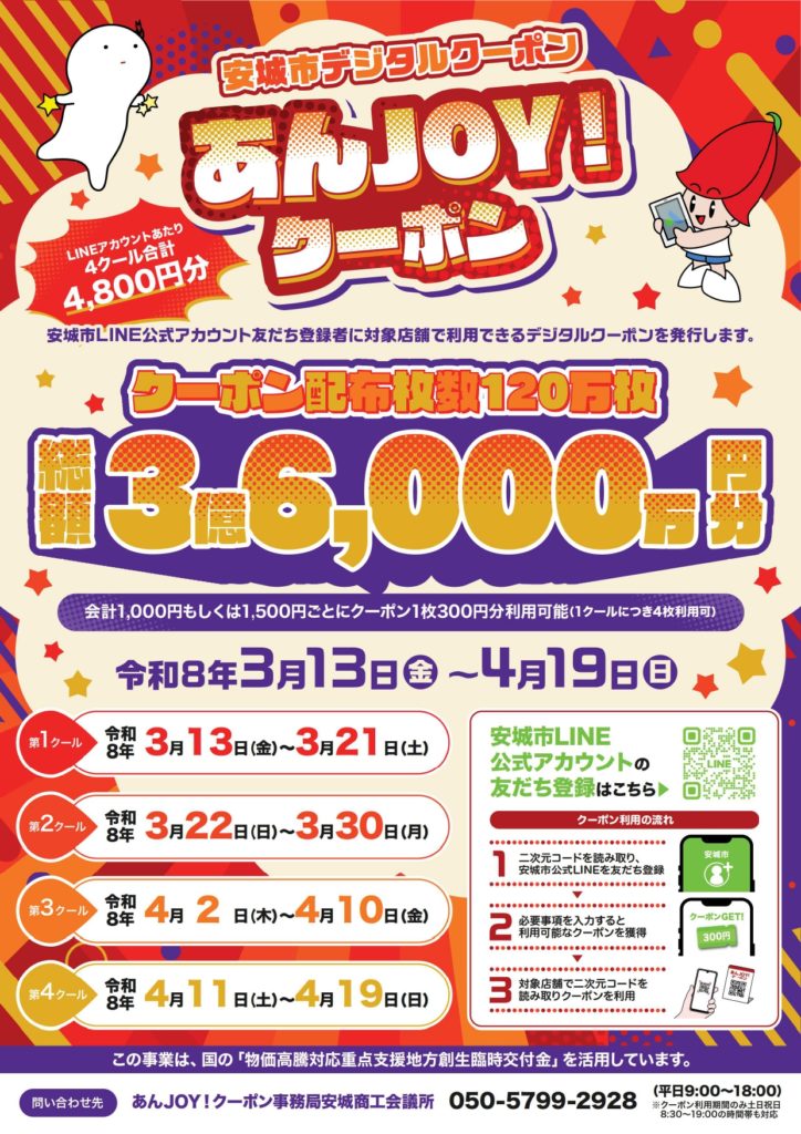 安城デジタルクーポンが使えます。エネルギー・食料品価格等の物価高騰の影響を受けている市民に対し、デジタルクーポンを発行することで負担を軽減し、併せて市内経済の活性化を図るため、国の「物価高騰対応重点支援地方創生臨時交付金」を活用して、「安城デジタルクーポン発行事業」を実施中です。